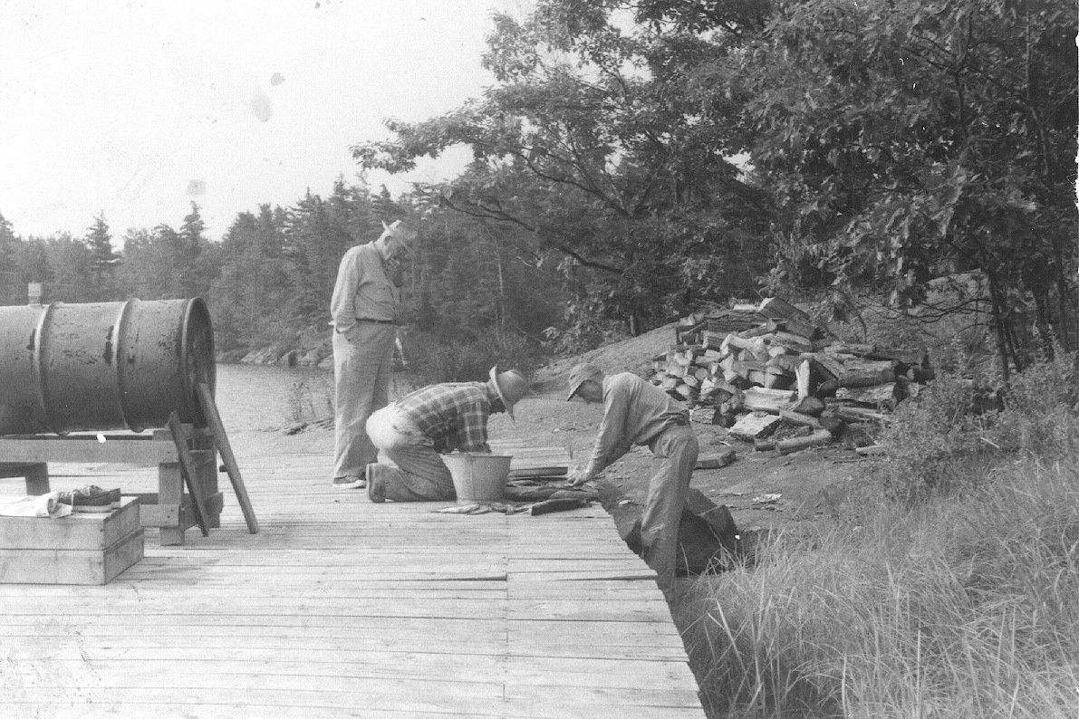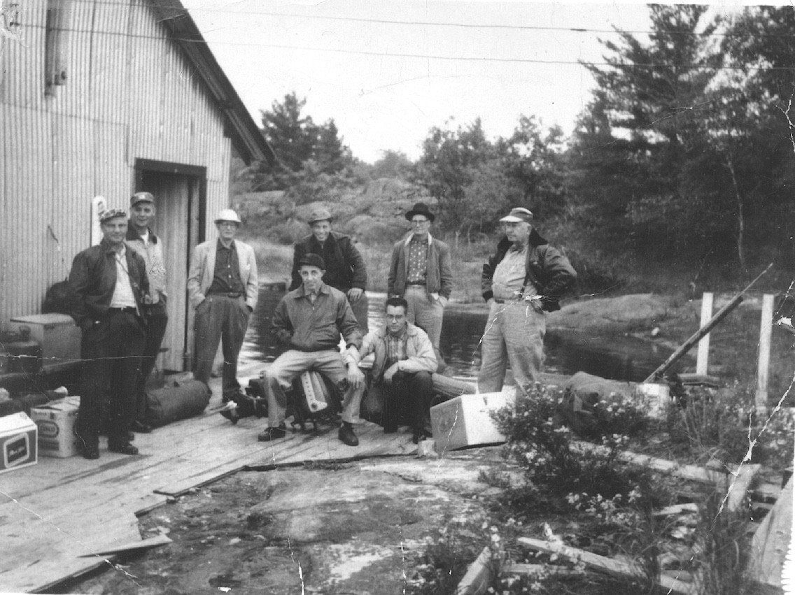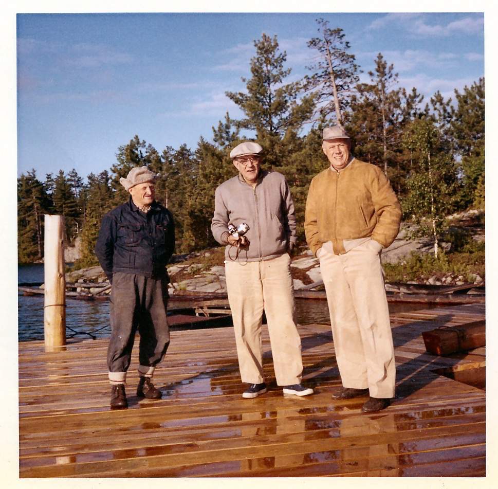 At Karl Rohrer's boathouse. Floyd Rice seated center.