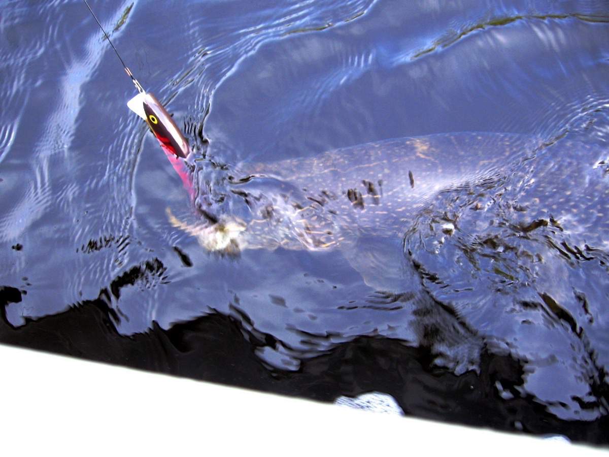 Preacher lure bringing in Joey's 38 inch pike.